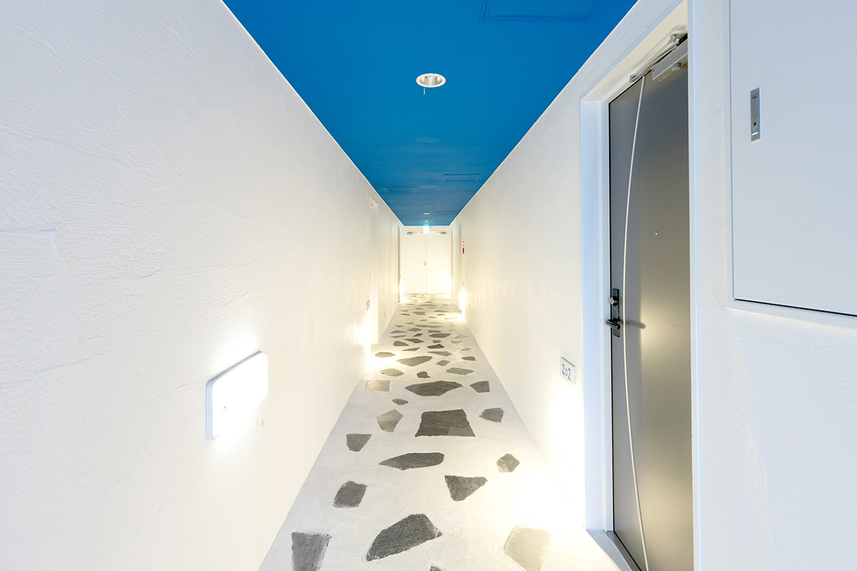 非日常的な漆喰とブルー基調の通路。